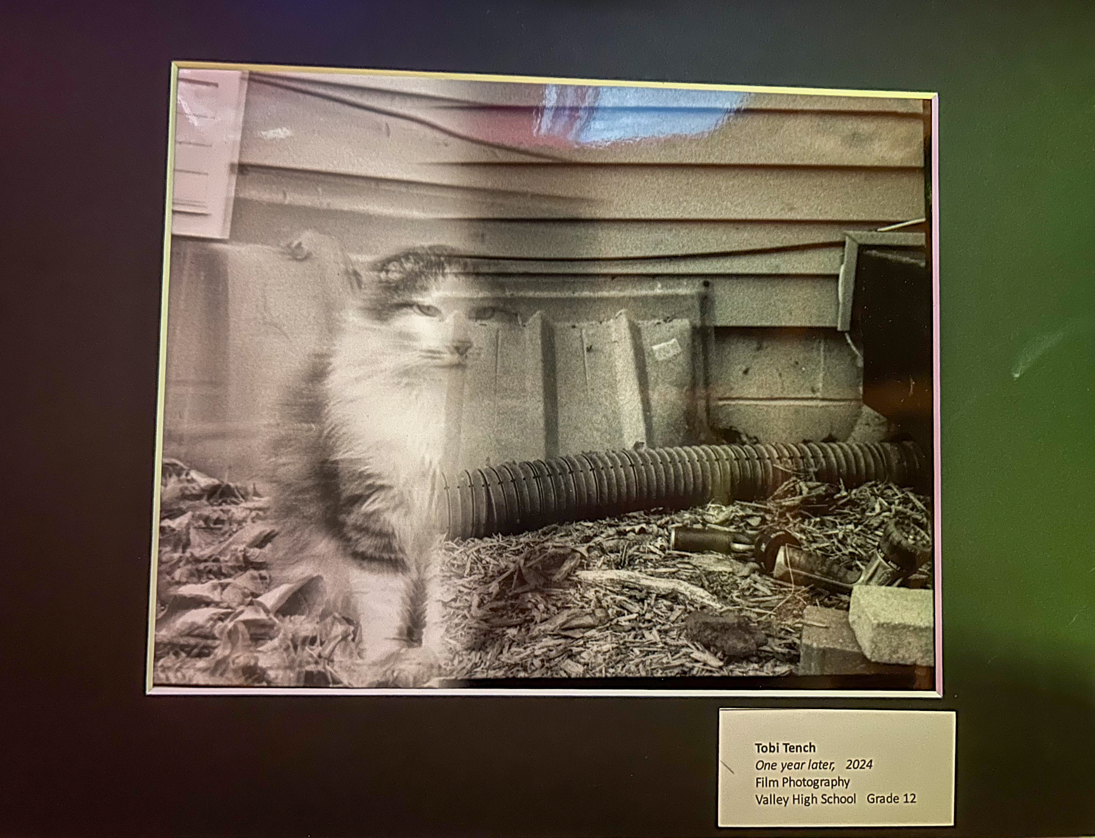 One of my most personal pieces I've done. I made this piece when my cat Jack passed away that year, I combined an older photo I took of him that I had took on film about a year prior, when I got the idea for this piece I decided to take a photo of that same spot to show he is no longer there, hence the name "One year later" I really like how it looks like he is fading out of the picture