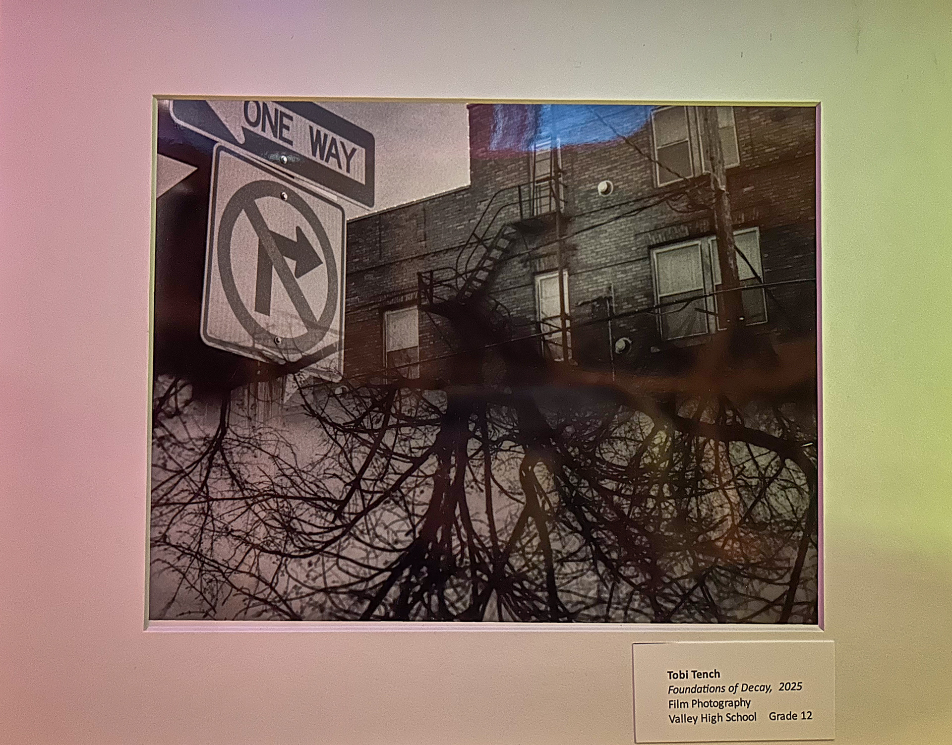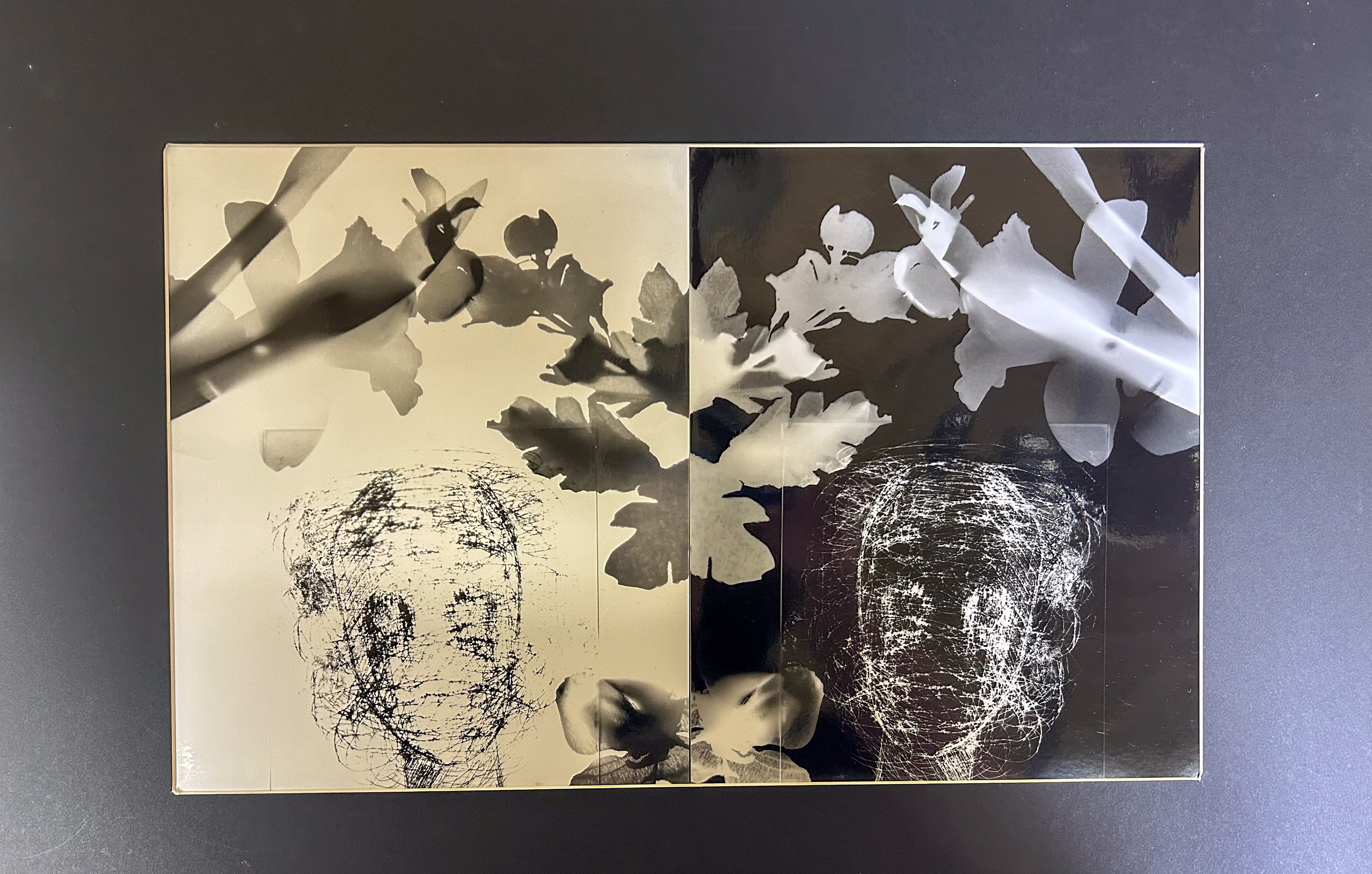 This piece is also important to me. The name of it is "Polar Opposites" This is a photogram which is the process of laying objects over photo paper where it will basically print the objects onto that paper once exposed to light, and then you develop it! I made this piece last year when I was feeling distraught with current events at the time (2024 election) And I needed to make a new piece for studio art so I just threw this together using stuff I found around the room, fake flowers that created what looks like a butterfly to me in the middle, and this random stencil of the face that I found in the room, so I put it on the paper and then inverted to make the other side and taped it together. Another reason this piece is very special to me is because I won an award for it! I won at the burbs art show and that is another reason it is special to me :)